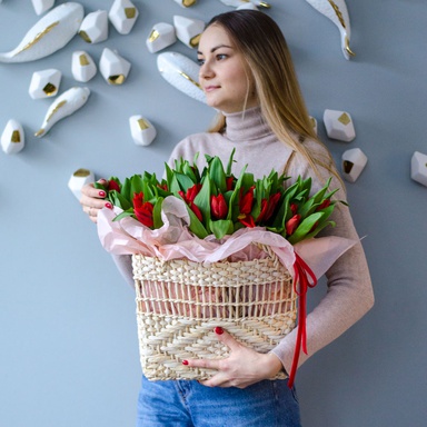 - Квіти в плетеній сумці "51 червоний тюльпан"