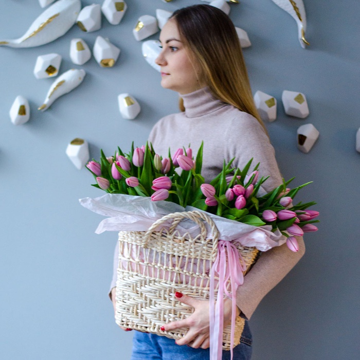 - Квіти в плетеній сумці "51 рожевий тюльпан"