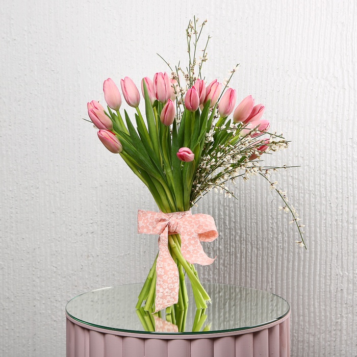 Букет "21 рожевий тюльпан" — це ніжна та гармонійна композиція, яка поєднує елегантність рожевих тюльпанів з яскравістю та ароматом джінестри. Кожен тюльпан у цьому букеті символізує ніжність, любов і теплі почуття, а квітуча джінестра додає композиції енергії, життєрадісності та особливого шарму. Ідеальне поєднання відтінків створює святковий настрій і підкреслює унікальність моменту, будь то День народження, річниця чи просто бажання подарувати тепло та увагу близькій людині.