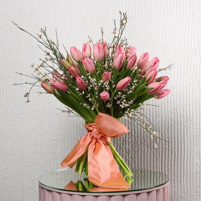 Букет "51 рожевий тюльпан" — це ніжна та гармонійна композиція, яка поєднує елегантність рожевих тюльпанів з яскравістю та ароматом джінестри. Кожен тюльпан у цьому букеті символізує ніжність, любов і теплі почуття, а квітуча джінестра додає композиції енергії, життєрадісності та особливого шарму. Ідеальне поєднання відтінків створює святковий настрій і підкреслює унікальність моменту, будь то День народження, річниця чи просто бажання подарувати тепло та увагу близькій людині.
