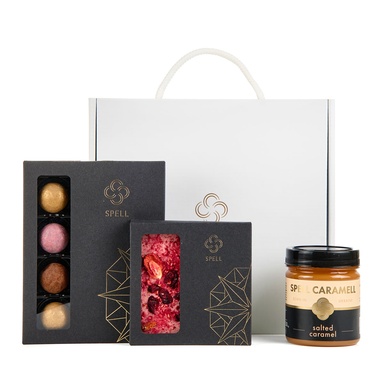 Ніжність квітів і солодкість мрій: зустрічайте подарунок, який вражає своїми смаковими барвами. Він складається з солоної карамелі, плитки білого шоколаду з журавлиною, вишнею та малиною та асорті трюфелів.