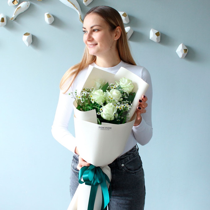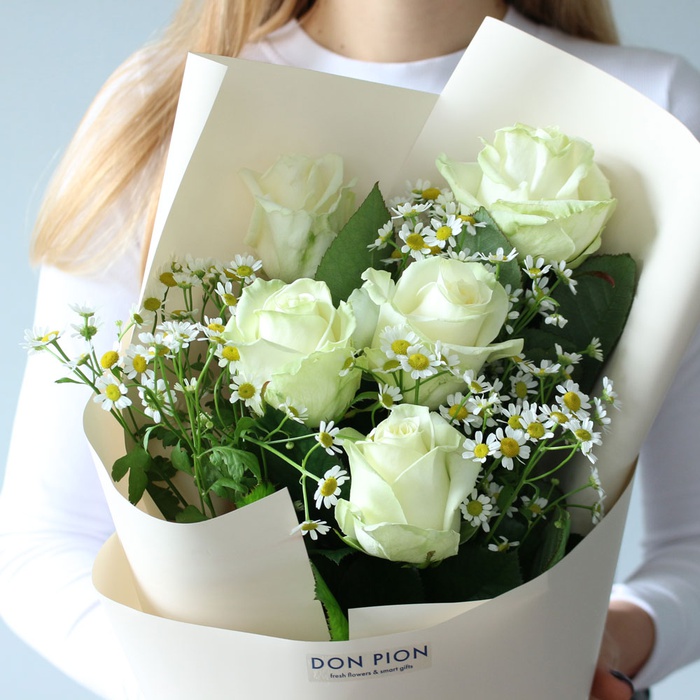 Ніжна хмара білих троянд та ромашок - це поєднання ніжності, невагомості та щирого захоплення.