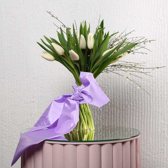 Букет "21 білий тюльпан" — це втілення чистоти, щирості та витонченої елегантності. Білі тюльпани символізують новий початок, повагу та світлі почуття, а доповнення ніжною джінестрою надає композиції легкості, об’єму та особливого весняного шарму. Гармонійне поєднання білосніжних бутонів і повітряних гілочок створює святковий, але водночас стриманий настрій, який ідеально підійде для дня народження, річниці, освідчення або як знак вдячності та турботи.